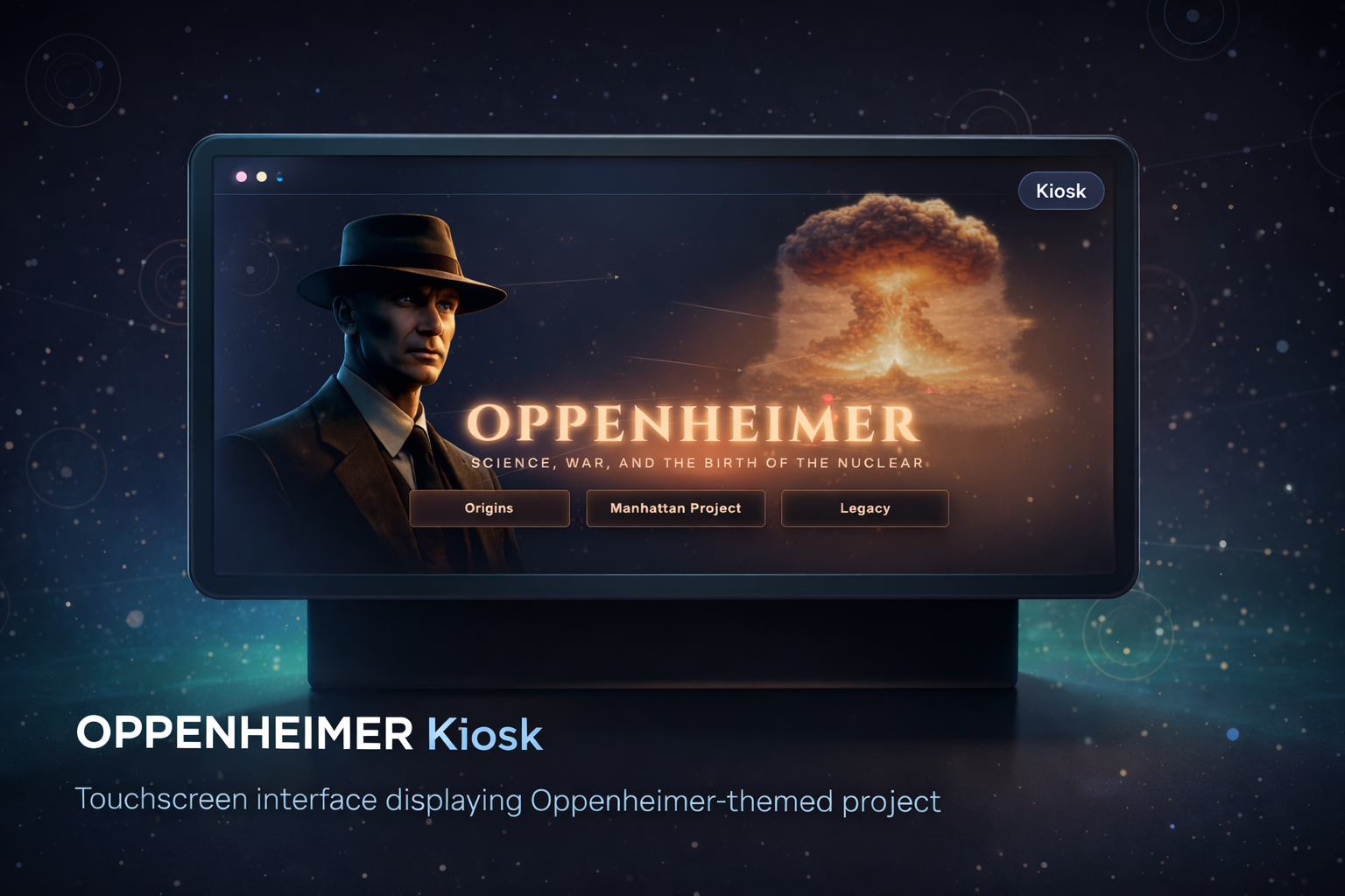 Touch-first Oppenheimer-themed kiosk interface designed for clarity, speed, and usability.
